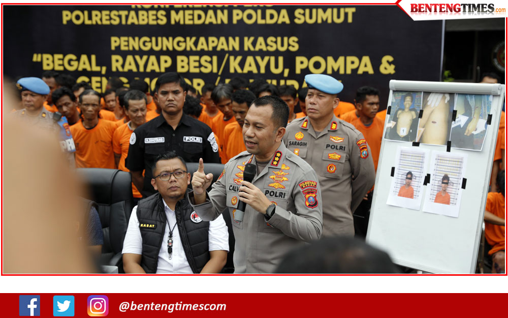 MEDAN, BENTENGTIMES.com– Jajaran Polrestabes Medan di bawah kepemimpinan Kombes Pol Jean Calvijn Simanjuntak kembali menorehkan hasil signifikan dalam pemberantasan kejahatan jalanan dan narkotika. Dalam kurun waktu 15 hari, periode 9 hingga 24 Oktober 2025, Polrestabes Medan telah mengungkap 103 kasus dengan 147 tersangka, terdiri dari kasus begal, rayap besi dan kayu, pompa (maksudnya: narkoba), serta kekerasan kelompok atau geng motor.