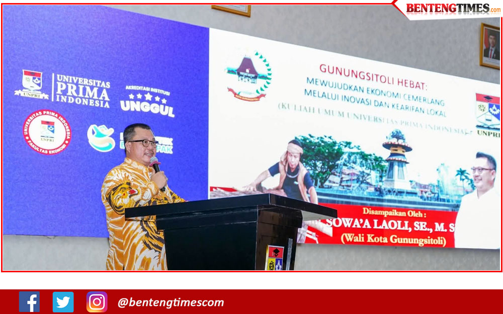 GUNUNGSITOLI, BENTENGTIMES.com– Wali Kota Gunungsitoli, Sowa’a Laoli hadir sebagai narasumber dalam Kuliah Umum bertema ‘Pengembangan Potensi Lokal dengan Inovasi dan Kearifan Lokal’ yang digelar Universitas Prima Indonesia (UNPRI) di Hall Utama lantai 10 Kampus Utama UNPRI, Medan, pada Sabtu (22/11/2025). Acara dihadiri sekitar 1.000 mahasiswa, baik secara luring maupun daring, dari Program Studi Ilmu Pemerintahan serta rumpun ilmu terkait.