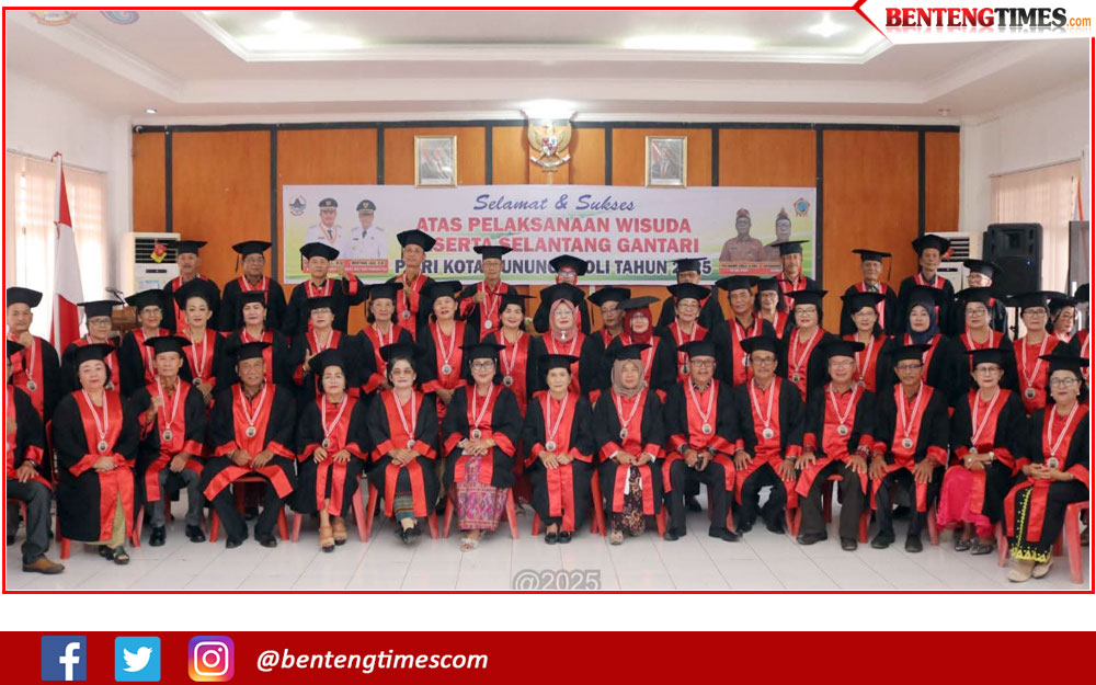 GUNUNGSITOLI, BENTENGTIMES.com– Prosesi wisuda Sekolah Lansia Tangguh GANTARI PWRI Kota Gunungsitoli digelar dengan suasana khidmat di Halaman Kantor Wali Kota Gunungsitoli, Selasa (2/12/25). Acara ini dihadiri Wali Kota Gunungsitoli, Sowa’a Laoli, Wakil Wali Kota Martinus Lase, serta pj Sekretaris Daerah Kota Gunungsitoli.
